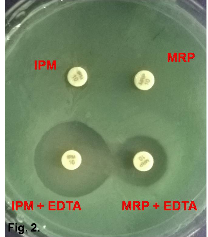 Fig. 2: Carbapenenem-EDTA Combination disk method for MBL detection. The inhibition zone around the IPM+EDTA and MRP+EDTA disk is apparently larger than around the IPM and MRP disk respectively, indicating MBL production. Abbreviations: IPM, Imipenem (10 µg); IPM+EDTA, Imipenem (10 µg)+5 µl 0.5M EDTA; MRP, Meropenem (10 µg); MRP+EDTA, Meropenem (10 µg)+5 µl 0.5M EDTA