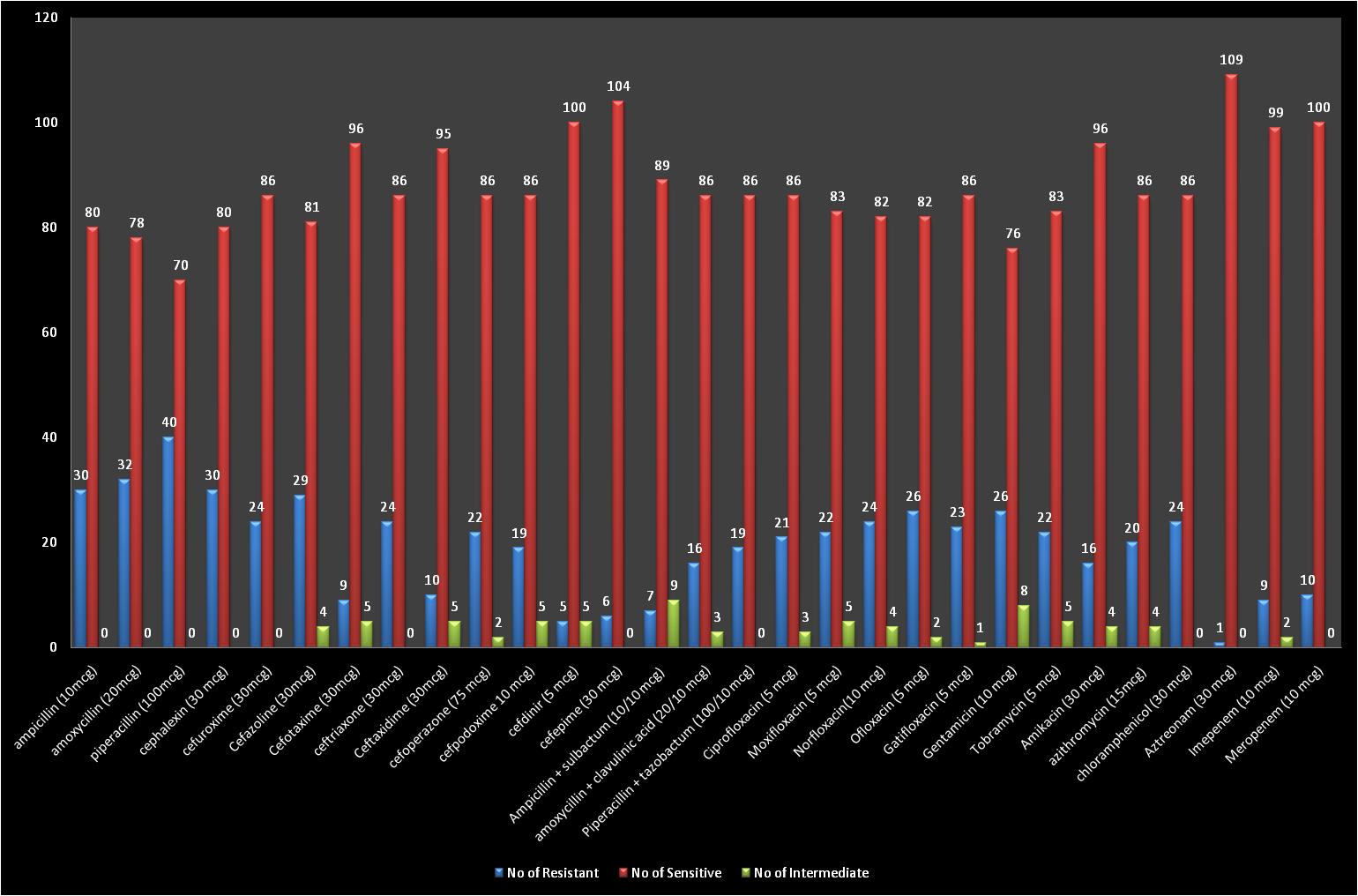 Out of 110 P aeruginosa tested, drug susceptibility rate was higher for beta lactam group of drugs such as 109 (99.09%) Aztreonam, 104 (94.5%) Cefepime, 100 (90.90%) for both Meropenem and cefdinir, 99(90%) Imipenem drug and the least susceptibility rate for 70 (63.63%) piperacillin followed by 76 (69.09%) amoxycillin and 80 (72.72%) cephalexin. Aminoglycosides suscebtibility was 96 (87.27%) amikacin followed by 83 (74.54%) tobramycin and 76 (69.09%) gentamycin. Quinolones/Fluoroquinolone susceptibility was 86 (78.18%) for both ciprofloxacin and gatifloxacin followed by 83(75.45%) moxifloxacin and 82(74.54%) for both norfloxacin and ofloxacin (Graph: 1)