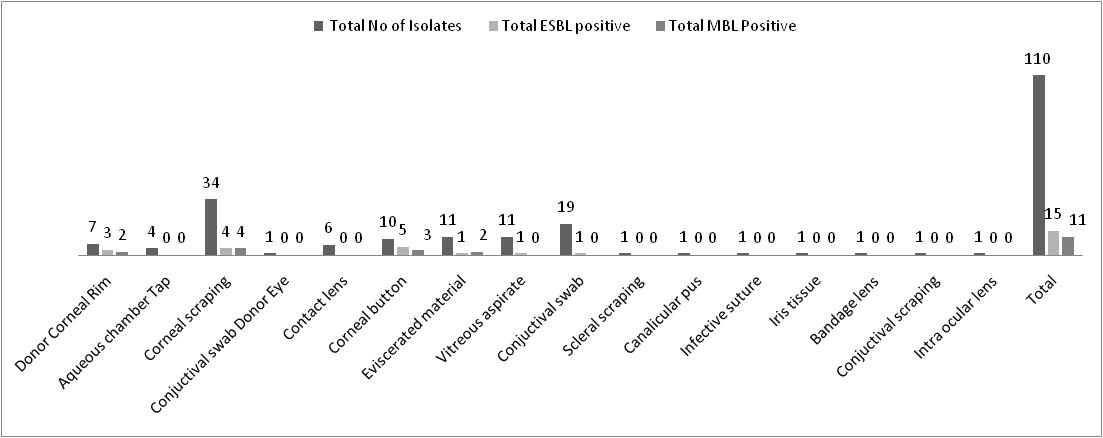 Methods: All ocular specimens, culture positive for P aeruginosa (n=110) isolated from clinically suspected patients were submitted to L &T Microbiology Research Centre, Chennai, Tamil Nadu, India. Culture, antimicrobial susceptibility testing and ESBL detection was performed by Standard methods. MBL production was screened by Carbapenem-EDTA combination disk method.