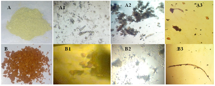 Fig. 2: Powder microscopy of M. oleifera and J. sambac dried flower. A: Pulverized sample of M. oleifera; A1: Abundant Calcium oxalate crystals with small spherical oil globules and starch grains; A2: irregular fragments; A3: tannin content; B: Pulverized sample of J. sambac;B1:Tannin; B2: oil globules; B3: simple fiber