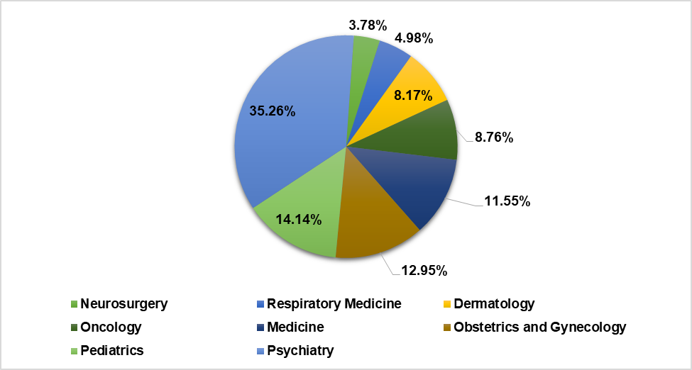 Our study found significant variation in ADRs across departments, with psychiatry reporting the highest incidence, followed by pediatrics and obstetrics/gynecology. In contrast, Modi et al. reported that dermatology recorded the highest number of ADRs [35].
