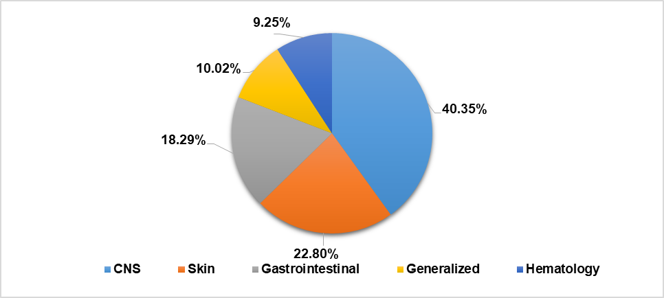 Fig. 2: Organ affected due to adverse drug reactions, varying rates of occurrence were observed among the different drug classes collected from ADR forms. The highest rate was reported for antipsychotics at 30.75%, followed by antibiotics at 12.28% and anticonvulsants at 9.27%. Minimal rates, ranging from 5.26% to 6.76%, were observed in chemotherapy agents, hormones, and antiemetics. Miscellaneous drugs had a rate of 4.51%, while analgesics were reported at 5.51%. Other drug classes, including PPIs, antivirals, blood transfusions, and anti-TB drugs, showed rates below 5.01% (fig. 3)