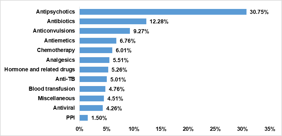 Diverse drug classes exhibited distinct occurrence rates in collected ADR forms. Antipsychotics had the highest reported rate, succeeded by anticonvulsants and antibiotics. In parallel, a study conducted by Kaur and Princy et al. found that antibiotics were most frequently linked with ADRs, followed by antipsychotics [38, 39].