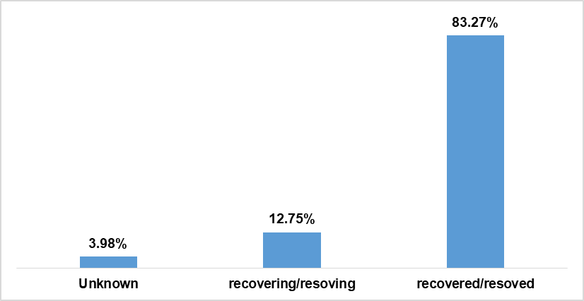 The outcomes of adverse drug reactions varied as follows: 3.98% were classified as "unknown", 12.75% were categorized as "recovering/resolving", and a significant majority, 83.27% were "recovered/resolved" (fig. 4).