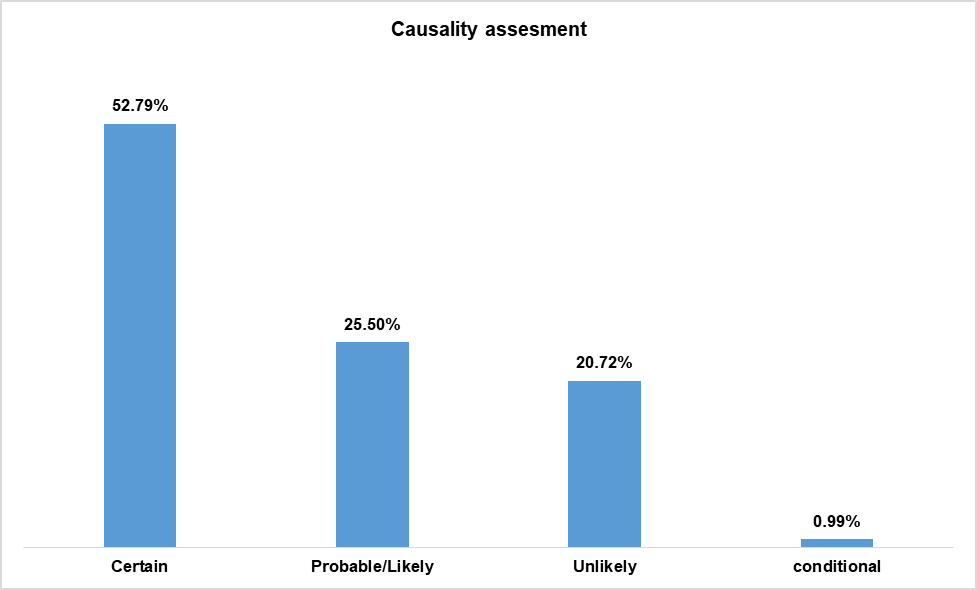 Fig. 4: Outcome of ADRs from suspected ADR reports, the causality assessment revealed that 52.79% were categorized as "certain", 25.5% as "probable or likely", 20.72% as "unlikely", and only 0.99% as "conditional" (fig. 5)