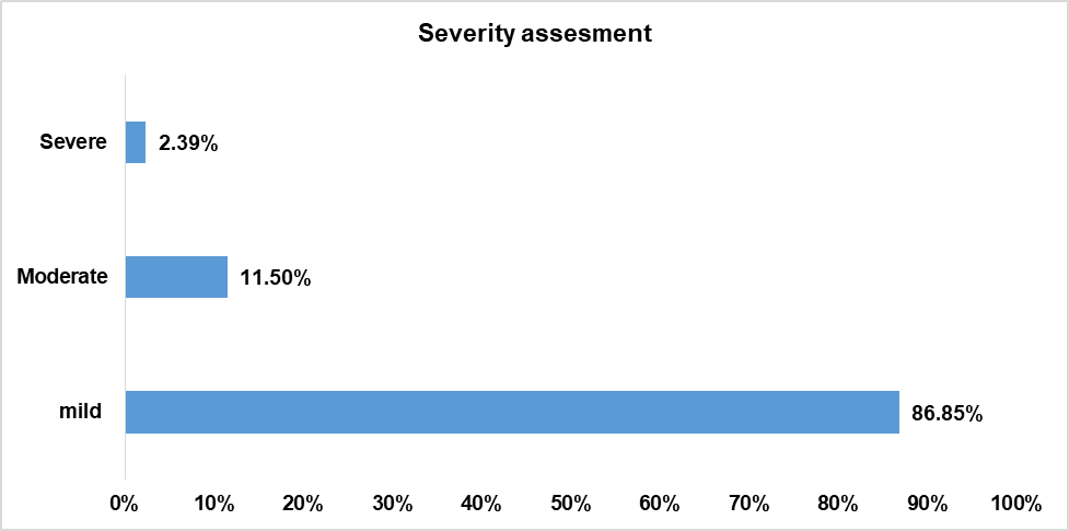 Fig. 5: Causality Assessment of Suspected ADRs according to the WHO-UMC scale, regarding the severity of the cases, 86% of the cases were classified as mild, 11% as moderate, and 2% as severe (fig. 6)