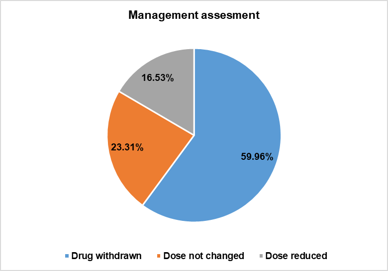 Fig. 6: Severity assessment of suspected ADR forms; after assessing adverse drug reactions, it was noted that the drug was withdrawn in 59.96% of cases, the dose remained unchanged in 23.31% of cases, and a dose reduction was implemented in 16.53% of cases (fig. 7)