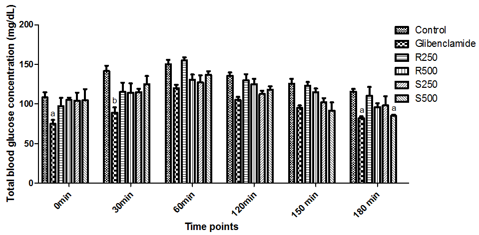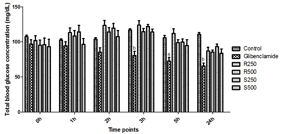 Rats were divided randomly into six different groups (n=6) each for normoglycemic and OGTT study and received the treatment like Control group: 0.5% CMC, (1 ml/kg), Standard group: glibenclamide (0.25 mg/kg), R250:methanolic extract of roots (250 mg/kg), R500:methanolic extract of roots (500 mg/kg), S250:methanolic extract of stems (250 mg/kg), S500:methanolic extract of stems (500 mg/kg).