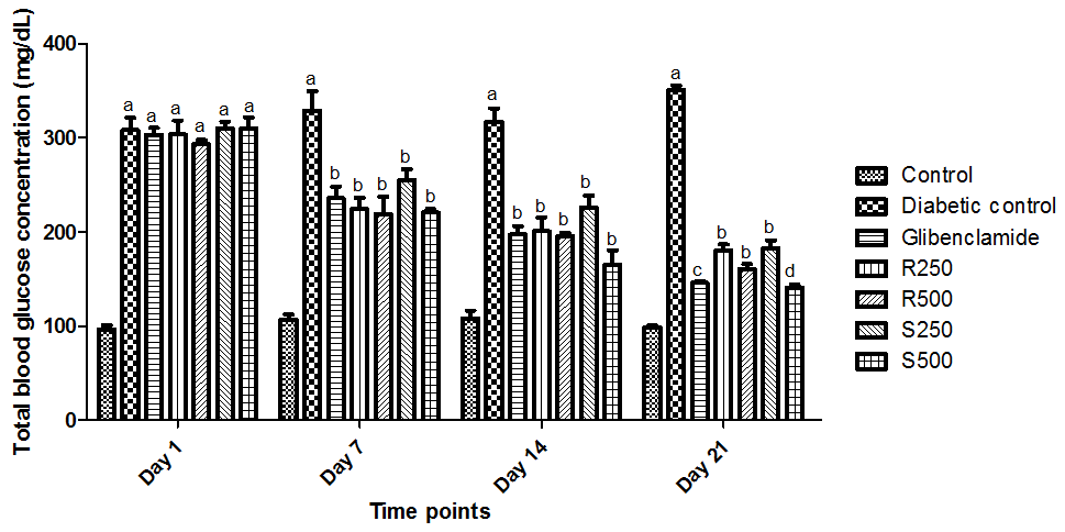 The diabetic rats were randomly divided into seven different groups with six rats in each group with dosage regimen, control: 0.5% CMC, (1 ml/kg), diabetic control: STZ, 45 mg/kg, i. v., glibenclamide as standard (0.25 mg/kg), R250:methanolic extract of roots (250 mg/kg), R500:methanolic extract of roots (500 mg/kg), S250:methanolic extract of stems (250 mg/kg), S500:methanolic extract of stems (500 mg/kg). Standard as well as extracts were administered orally and all groups except the control group received STZ (45 mg/kg, i. v.) along with respective doses of treatment.