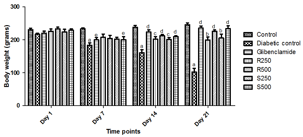 In order to determine chronic effect, MES and MER were administered at two dose levels (250 and 500 mg/kg) to the rats for 21 days and blood glucose levels were monitored changes in blood glucose levels were followed by 7 days in all groups (fig. 7). S500 showed highest % decrease in blood glucose level (54.69%) compared to R250, R500 and S250 which showed marked decrease in the order, R500 (45.31%)>S250 (41.05%)>R250 (40.57%) compared to standard (52.01%). Body weights of animals were found to decrease significantly (p<0.001) in diabetic control group as compared to control from day 7 (fig. 8). Our results suggested that R250 and S250 were able to show restoration of body weights near to normal significantly (p<0.001) after 21 days.