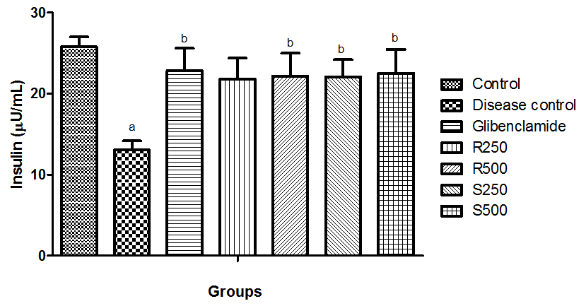 The effects of streptozotocin on glucose and insulin homeostasis reflects the abnormalities in β-cell functioning [62, 63]. In our study, the insulin was found significantly (P<0.05) elevated compared to greatly depleted levels in diabetic control (13.03±1.136 µU/ml) with the highest levels observed in S500 (22.52±2.941 µU/ml) followed by R500 (22.14±2.848 µU/ml) and S250 (22.06±2.133 µU/ml). The decreased serum glucose as well as increased serum and pancreatic insulin observed in our study indicated that amongst all test groups, MER and MES have presented promising antidiabetic action.
