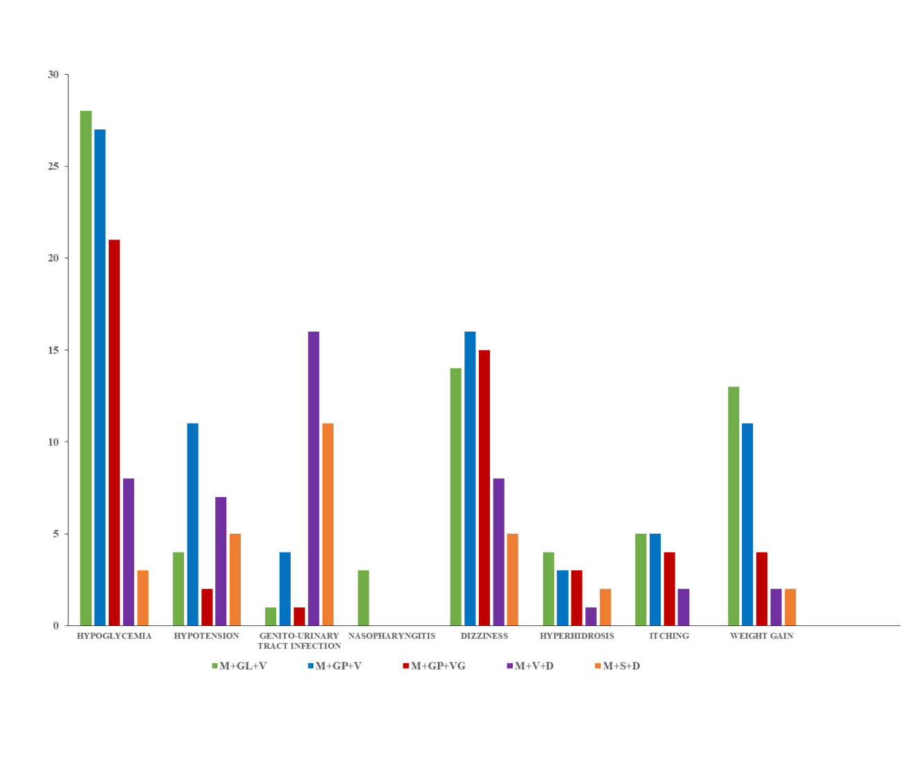 Incidence of hypoglycemia, dizziness and weight gain were observed less in M+S+D and M+V+D group whereas more number of hypoglycemic events, dizziness, weight gain and Hypotension was observed in M+GP+VG, M+GL+V and M+GP+V groups. Although Dapagliflozin use slightly raised Genito-urinary infection risk due to glucosuria, it was manageable with proper hygiene and hydration.