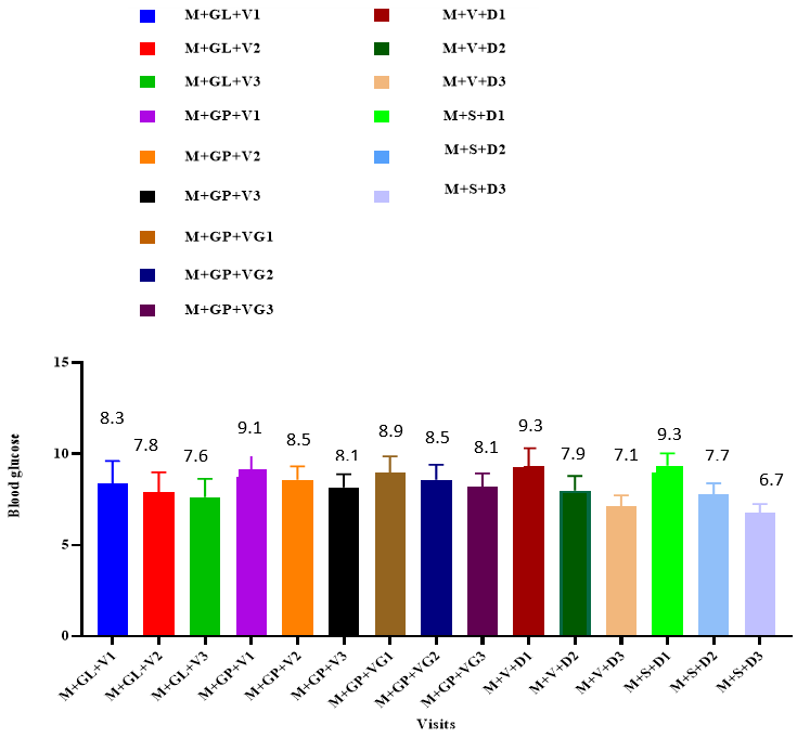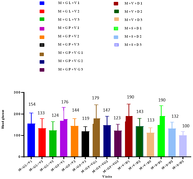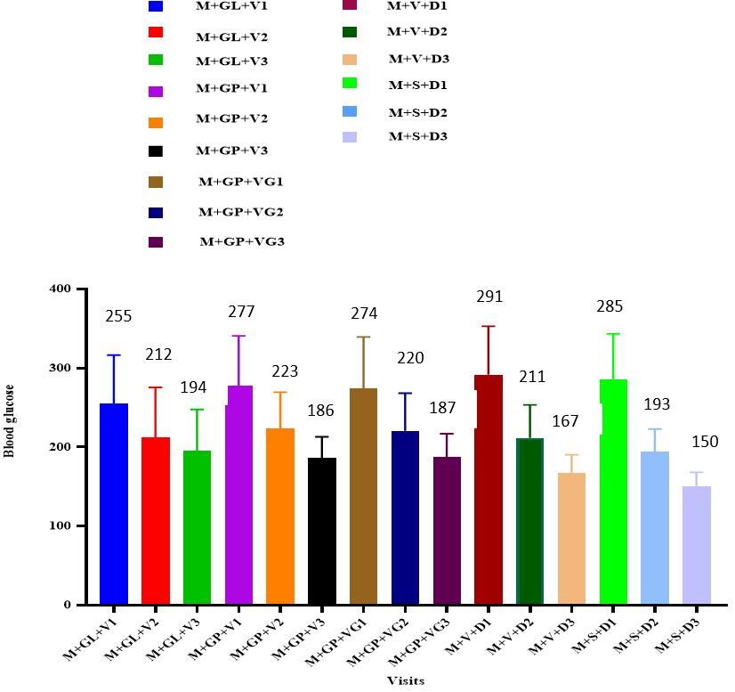 M= Metformin, GL= Gliclazide, GP= Glimepiride, VG= Voglibose, V= Vildagliptin, S= Sitagliptin, and D= Dapagliflozin, Mean±SD: Represents the Average±Standard Deviation of FBS levels measured at each visit. Visit-1, Visit-2, Visit-3: Measurements taken at baseline, 3 mo, and 6 mo post-treatment, respectively. P-Value: Statistical significance of changes between visits, determined by one-way ANOVA. ****<0.0001 indicates very high statistical significance. Average reduction % V1-V2 and V1-V3 = The percentage reduction in FBS levels from Visit-1 to Visit-2 and Visit-1 to Visit-3, respectively, indicates the treatment’s effect over time.