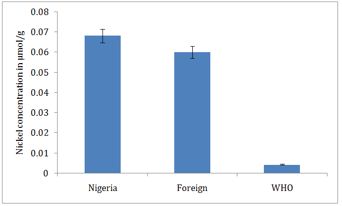 Fig. 3 depicts the levels of nickel in the Nigerian made tobacco snuffs in comparison with the foreign samples also placed side-by-side with WHO standard. There was a statistically significant higher level of heavy metal nickel in the Nigerian tobacco snuff than in the foreign smokeless variety (Z-score = 2.78, p<0.05).