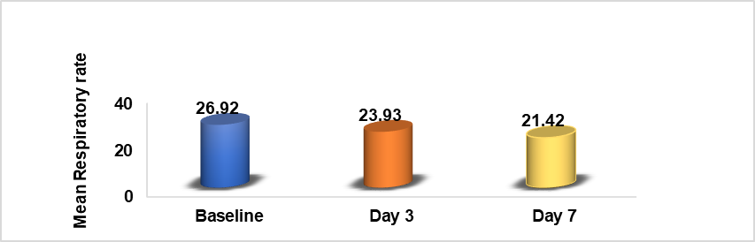 Respiratory rates: Respiratory rates were recorded at baseline, Day 3, and Day 7. A significant reduction in tachypnea (rapid breathing) was observed, with P<0.0001 indicating a strong correlation between MB treatment and improved respiratory function. The findings in table 4 and Graph 4 highlight that Methylene blue helped reduce abnormal breathing patterns, a common complication in severe COVID-19 cases.