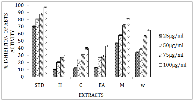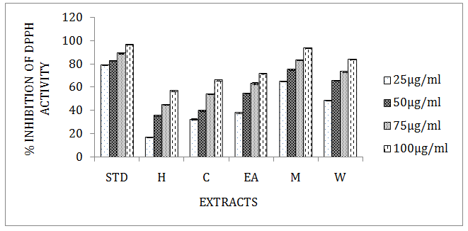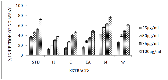 NO scavenging assay exhibited concentration dependent increase in %inhibition among all the extract, where the maximum %inhibition of the extracts in methanolic extract of about 77.19±2.32% at 100 µg/ml compared to the other extracts.