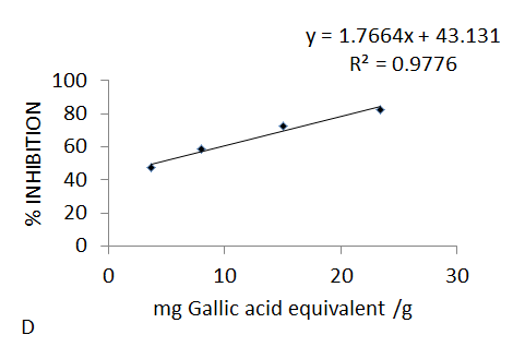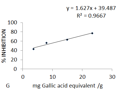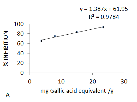 The significant linear correlation (coefficient R2≥ 0.98and two-tailed p value ≤ 0.05) between the total phenolic content and DPPH activity of methanolic plant extracts concluded that the phenolic compounds might be responsible for the antioxidant activity [32].
