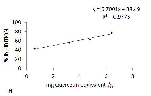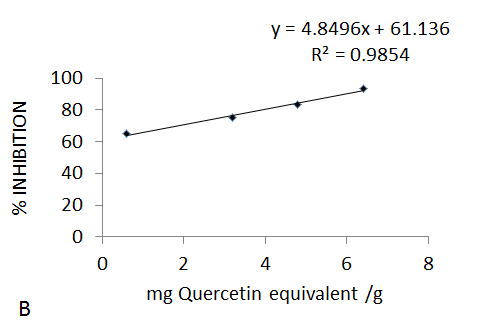 Flavonoids were determined using aluminium chloride colorimetric method according to Chang et al. [19] with some modifications. An aliquot of 1 ml of leaf extracts were mixed with 0.5 ml of 5% sodium nitrite, after 5 min 0.5 ml of 10% aluminium chloride was added and the absorbance was measured at 420 nm. Flavonoid contents were determined from quercetin standard curve and were expressed as mg Quercetin equivalent (QE) per gram of extract.