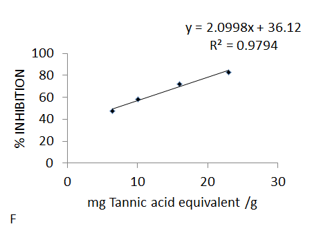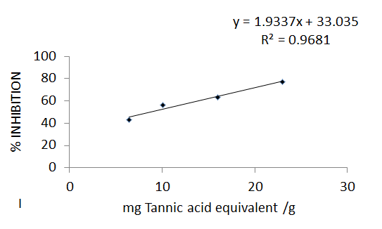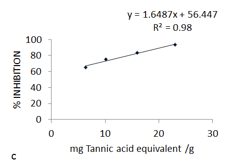 Amount of tannins in the leaf extracts were determined by Folin Denis method [20] extracts of various concentrations 1 ml mixed with 0.5 ml Folin-Denis reagent and after 5 min 1 ml of sodium carbonate solution was added. Absorbance of sample was measured against the blank at 700 nm. Tannic acid was used as standard the results were expressed as mg tannic acid equivalents (TAE) per gram of extract.