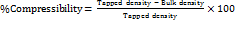 The sample was transferred in to a 10 ml graduated measuring cylinder. Then cylinder was tapped manually by raising the cylinder and allowing it to drop under its own weight. Cylinder was tapped for 100 times and tapped volume was measured. The test was repeated thrice (n = 3). Tapped density in g/cm3was calculated by the following formula: