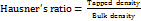 Hausner’s ratio is an indication of the flowability of powder and if the ratio is greater than 1.25 is considered to be an indication of poor flowability. Hausner’s ratio was determined by the following equation. The test was done in triplicate (n = 3) [10].