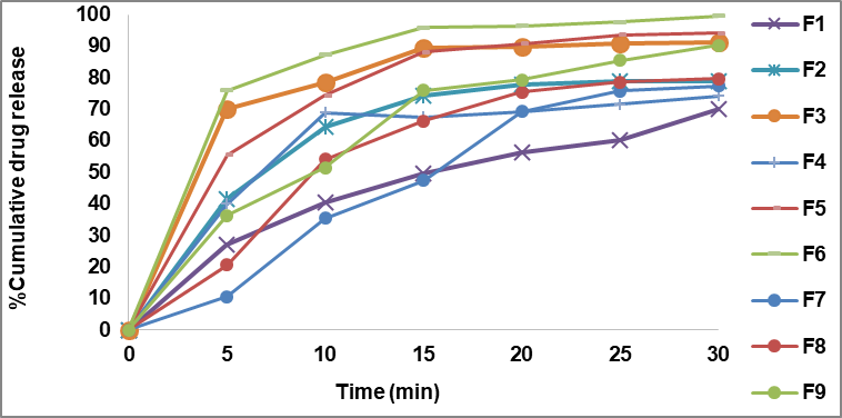 Fig. 1: In vitro release profile of core tablets (F1-F9)