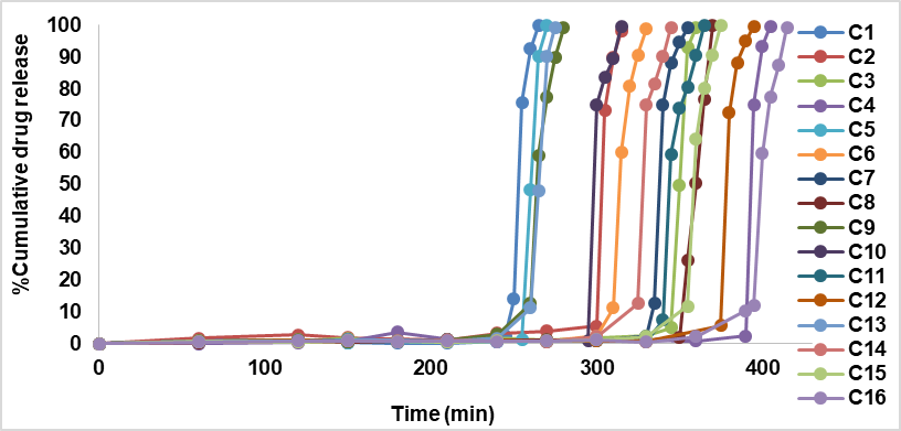 Fig. 2: In vitro release profile of compression-coated tablets (C1 to C16)