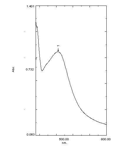 Silver nanoparticles appear brown in colour in aqueous medium as a result of surface plasmon vibrations [20]. In previous studies, similar colour change was observed [21-23]. Synthesis of silver nanoparticles in sterile distilled water was confirmed by using UV-vis spectrophotometer in a range of wavelength from 200 to 800 nm. As an Aegle marmelos leaf extract was mixed in aqueous solution of silver ion the reduction of pure silver ions to silver nanoparticles was confirmed by measuring UV–vis spectrum of the reaction media. The UV-Vis absorption spectrum of silver nanoparticles in the leaf extract is shown in fig. 1. The spectroscopic band of silver nanoparticles solution was found to be close to 450 nm which confirms the synthesis of silver nanoparticles. This absorption strongly depends on the particle size, chemical surrounding and dielectric medium [24].