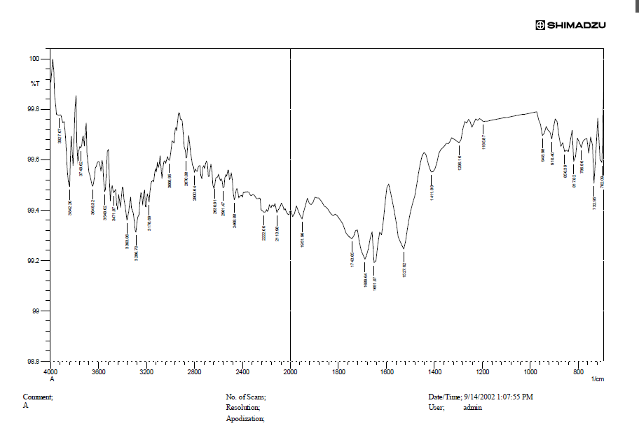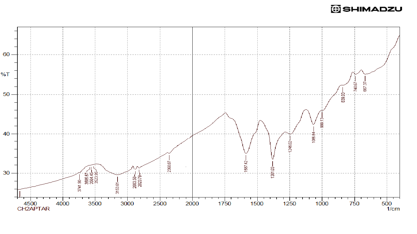 To investigate the functional groups of Aegle marmelos leaf extract responsible for synthesis and stabilization of silver nanoparticle, a FT-IR study was carried out and the spectra are shown in fig. 2. It shows a number of absorption peaks, reflecting the complex nature of the extract. A peak at 3286 cm−1 is results from the stretching of the–OH bond of alcohol groups and it indicates bonded hydroxyl (-OH) group. The absorption peak at 3471 cm−1 could be due to–NH stretching of amine functional groups The peak at 2222 cm−1 assigned for a C=N group of nitrile. The peak at 1689 cm−1 indicates the C–O stretch. The absorption peaks at 1527 cm−1 could be assigned for the presence of N–O stretching in nitro. The band at 1195 cm−1 can be by the C=N stretching vibrations of aliphatic amines. The peak 736 cm−1is due to–C-Cl stretch of alkyl halide FTIR study represents the hydroxyl (-OH), carboxyl (-C=O) and amine (-NH) groups of caumarins, tannins or alkaloids of the Aegle marmelos leaves extract are mainly involved in reduction of silver ions to silver nanoparticles. In FTIR spectra of synthesized silver nanoparticles bands of absorbance observed at around 740, 999, 1246 and 3153 cm−1 and these bands are matching to plant extract FTIR spectrum. This denotes coumarones and tannins from plant extract may responsible for reduction and stabilization of silver ions to silver nanoparticles.