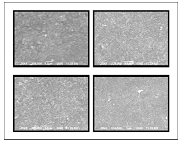 Shape and morphology of the synthesized nanoparticles were identified by scanning electron microscope analysis. The nanoparticles were examined under various magnifications of ×15,000, ×30,000, ×45,000 and ×55,000 SEM images of the synthesized silver nanoparticles are shown in fig. 3. It shows relatively spherical-shaped nanoparticles.