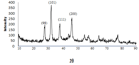 These diffraction lines are obtained at 2θ angles, which have been indexed as (98), (101), (111) and (200) plane of fcc silver by comparing with JCPDS data. Similar observations were reported by Ondari and Nalini for silver nanoparticles synthesized using Trdax procumbens [26] The Debye-Scherrer equation was used to determine the average particle size of the nanoparticles [27]. D = K λ/β cosθ. Were, D is the crystal size of nanoparticles, λ is the wavelength of the X-ray source (1.54 nm) used in XRD, β is the full width at half maximum of the diffraction peak (FWHM) K is the Scherrer constant with a value from 0.9 to 1, and θ is the Bragg angle. Assccording to Debye Scherrer equation the average particle size was found to be 15-30 nm.