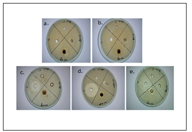 Fig. 7: Antibacterial activity of silver nanoparticles-a. Streptococcus pyogenes, b. Staphylococcus aureus, c. Aeromonas hydrophila, d. Escherichia coli, and e. Pseudomonas aeruginosa