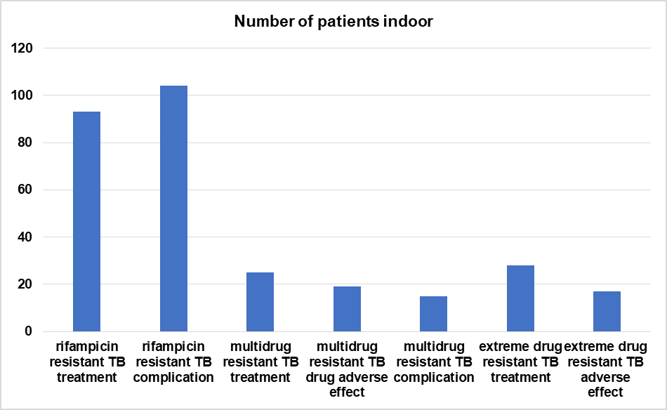 During the study period, we reviewed a total of 301 case records. The patients included were admitted mainly due to drug resistance (treatment, adverse effect, and complication). 63.12% of the inpatients were male, while 36.88% were female. The average age of the patients was 36.2 years, with a standard deviation of 12.6. Hospital stays ranged from 1 to 23 d, with a median of 9 d.