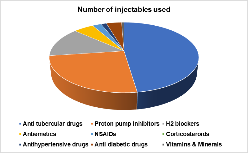 Fig. 2: Illustrates the number of injectables utilized in inpatient settings, Twenty-three percent of prescriptions included injectables, with antitubercular drugs being the most common. Proton pump inhibitors (5.7%), H2 blockers (3.1%), antiemetics (1.2%), and insulin (0.9%) were among the frequently utilized injectables