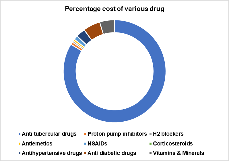 Drug costs were significantly impacted by the fact that antibiotics were the most often-given drugs, accompanied by vitamins and minerals, NSAIDs, and proton pump inhibitors. Limiting the use of more costly, recent antibiotics, branded medications, and the number of medications given can drastically lower the cost of drug therapy. We worked diligently to provide the tuberculosis elimination program with the expertise and experience it needed to make decisions and use its resources in an efficient manner to achieve cost-effective healthcare in response to the demands of policymakers who sought quantitative analysis and improved TB control policy and implementation.