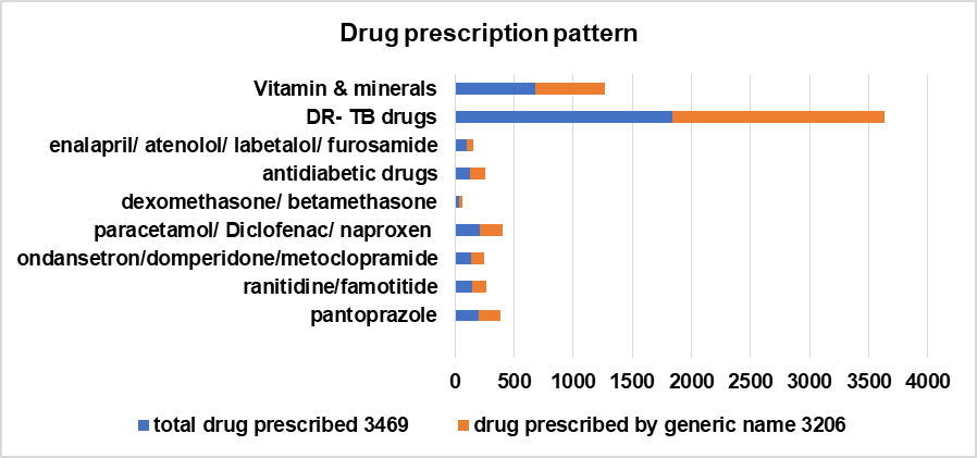We gathered information by reviewing inpatient case files kept in the hospital's medical records division. We selected 301 case reports of individuals with drug-resistant TB from December 2018 to December 2021. The government drugstore provided the medications, while the treating physicians wrote the prescriptions. The national tuberculosis elimination program provided free drug comes to central drug store, from where patients procured all anti-tubercular medications. We carried out the data extraction and collection procedure. Utilizing a template that inquired about the patient's age, gender, diagnosis, length of hospital stay, and prescription information, including the name, strength, dosage form, frequency of administration, and quantity of units administered, it also inquired as to whether the medications were prescribed under a generic name. Additionally, we examined the World Health Organization core drug prescribing indicators. The average number of prescription drugs, the percentage of generic drugs, the percentage of prescriptions with antibiotics, the percentage of prescriptions with injections, the percentage of prescription drugs from an essential medication list, and the average cost of prescription drugs were some of the things that were looked at [1].