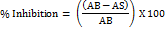 Where, AB–Absorbance of blank sample (t = 0 min); AS–Absorbance of test samples (t = 30 min).