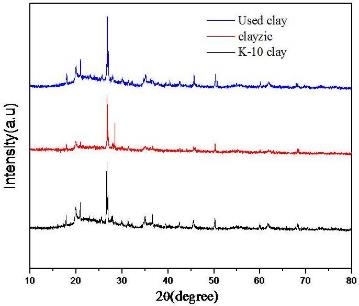 The catalyst was prepared by impregnating 1g K-10 clay (surface: 220-270 m2/g; bulk density: 300-370 g/l) with 1g of powdered anhydrous zinc chloride in tetrahydrofuran (THF). The clayzic suspension was centrifuged, dried at 80oC for 2h and grounded into a fine powder. Then, the catalyst was dried and stored in a moisture-free environment. Before using for the reaction, the catalyst was heated to 100oC to remove the absorbed moisture. The XRD pattern in the fig. 1 clearly confirms the presence of the zinc on the active sites of the K-10 clay catalyst.