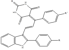 Yield 64% (Benzene): mp 278-280 °C; IR (KBr) vmax in cm-1: 3418, 2907, 2847, 1682, 1287; 1H NMR (DMSO-d6+CDCl3) in δ(ppm): 11.78 (s, 1H, indole NH), 9.53 (s, 1H, pyrimidine NH), 9.32 (s, 1H, pyrimidine NH), 6.81 (d, 2H, CH=CH-), 6.6-8.62 (m, 12H, Ar-H); 13C NMR (DMSO-d6+CDCl3)in δ(ppm): 145.2, 141.6, 141.3, 137.6, 131.6, 131.0, 130.1, 123.2, 121.3, 113.1 and 110.8; ESI-MS 503.08 [M+1]+.