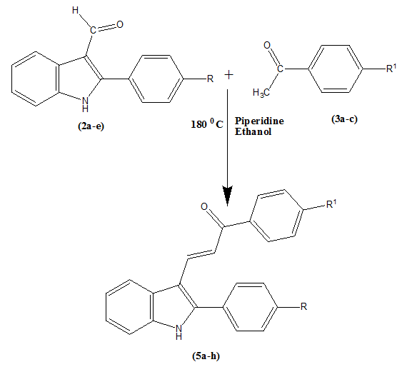 A mixture of 2-Phenyl-1H-indole-3-carbaldehyde (2a) (0.22 g, 1 mmol) and acetophenone (0.2 ml, 1 mmol) in anhydrous ethanol (30 ml) was refluxed in the presence of piperidine (0.5 ml) for 20 h. The reaction mixture poured into ice water, neutralized with acetic acid to get the solid compound which was filtered and recrystallized from ethanol to obtain pure compound. Yield 76%; dark brown solid; mp 170-172 °C; reported 171-172 °C [36], the compounds (5a-h) also synthesized by the above method. Physical and analytical data of these compounds (5a-h) shown in (table 2).