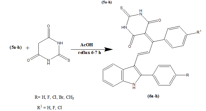 We carried out Claisen-Schmidt condensation reaction between 3-Formyl-2-phenylindole derivatives (2a-e) and various substituted acetophenones (3a-c) catalyzed by piperidine to get indolyl chalcones (5a-h) [32]. The condensation of indolyl chalcones (5a-h) with thiobarbituric acid in acidic media gave (6a-h) (Scheme-1). All synthesized compounds were characterized by IR, 1H NMR, 13C NMR and mass spectroscopic data.