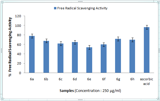 The free radical scavenging activity of synthesized compounds was done by DDPH method. Among synthesized compounds (6a), (6e), (6g), (6h) showed activity of 78 %, 54 %, 72 % and 70 % and respectively at 250 μg/ml, whereas ascorbic acid at the same concentration exhibited 96.66% inhibition respectively.