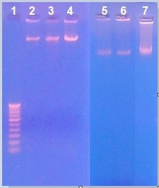 Removing the gel and stained with 10.0 mg/ml ethidium bromide for 10e 15 min, the bands were observed under Vilber Lourmat Gel documentation system and then photographed to determine the extent of DNA cleavage. The results are compared with standard DNA marker. DNA ladder was used 100-1000bp (100 bp step up ladder, Merck).