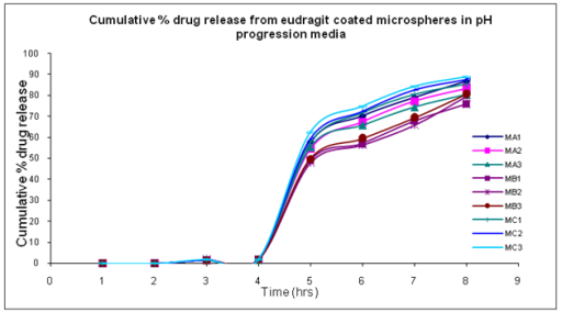 Eudragit-coated pectin microspheres and uncoated pectin microspheres were evaluated for the in vitro drug release in pH progression media. An accurately weighed amount of microspheres, equivalent to 100 mg of 5-ASA, was added to 900 ml of dissolution medium and the release of 5-ASA from microspheres was investigated using rotating paddle dissolution test apparatus (Electro lab, India) at 100 rpm and 37±0.5°C. The simulation of gastrointestinal transit conditions was achieved by altering the pH of the dissolution medium. Initially it was kept at pH 1.2 for 2 hrs with 0.1N H Cl. Then KH2PO4 (1.7 g) and Na2HPO4.2H2O (2.225 g) were added to the dissolution medium adjusting the pH 4.5 for 3rdand 4thhr and adjusted with Na OH to 6.8 for 5thhr. After 5thhr, the pH of the dissolution medium was adjusted to 7.5 and maintained up to 8hr. The final volume in all case was kept 900 ml. The samples were withdrawn from dissolution medium at various time intervals using a pipette fitted with micro-filter at its tips and analyzed Spectro photometrically at 267.7 nm.