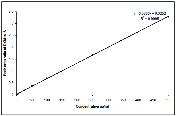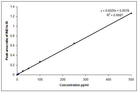 The typical chromatogram obtained from the analyses of three drugs with internal standard is presented in fig. 2. In the present analytical conditions, the retention time obtained for the drugs was 1.47 minutes for MTX, 4.05 minutes for DXM, 11.29 minutes for IND and 12.69 minutes for IBP. The calibration curve was linear in the range 1-500 µg/ml for MTX (fig. 3), DXM (fig. 4) and IND (fig. 5). The limit of detection (LOD) and limit of quantification (LOQ) for MTX, DXM and IND are reported in table 3. Intra-day and inter-day precision and accuracy of the assay is ascertained as precision (%) and accuracy (%), respectively on the basis of published guidelines [23, 24]. The obtained results are shown in table 1. The % recovery of MTX was from 99.23 to 100.69 %, for DXM was 99.2 to 100.89 % and for IND it was from 99.42 to 100.7 %. Results are shown in table 2. The results of ruggedness studies which were carried out using two similar HPLC in different laboratories by different analyst showed % CV<2 (table 4).