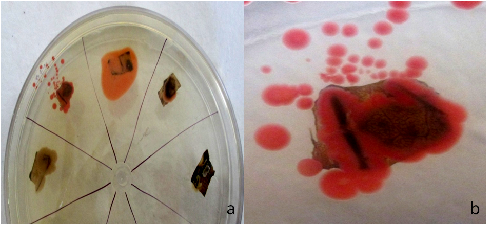 The method used for surface sterilization of Beta vulgaris has been optimized. After two weeks of incubation at 28 °C,a bright red colour endophytic bacteria (isolate KC1) was isolated from the leave explants of Beta vulgaris L.(fig. 1 a&b). The physiological and biochemical characterization of bacterial endophyte has been done. Based on morphological and partial biochemical characteristics, isolate KC1 was found a motile, coccobaccilus, Gram negative bacterium with red colonies, which gave a catalase positive reaction as described in table 1.