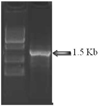 Fig. 3: PCR amplification of single 1.5 kb of 16 S rDNA amplicon16S rDNA gene on an agarose gel (1.2%). Lane 1: 1.5kb DNA (16S rDNA amplicon); Lane 2: DNA marker (1kb ladder).