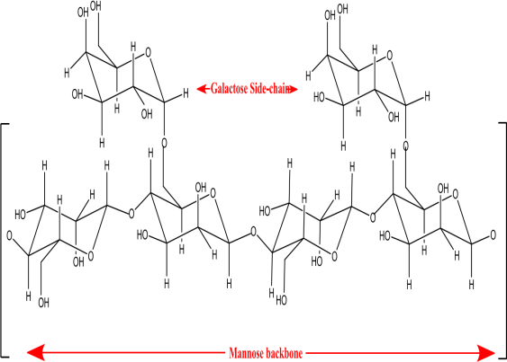 It is one of the most affordable sources of galactomannan. It is a hydrophilic carbohydrate polymer that is non-ionic. It is soluble in water and is non-ionic. It has been employed as a vehicle for colon targeting and oral drug delivery investigations. By cross-linking polyethylene glycol diglycidyl ether (PEGDGE) with polymer chains, the researchers created GG hydrogel. GG hydrogel's suitability for use as a drug delivery device has been demonstrated by rheological research and in vitro release tests [39]. Zarbab et al. developed guar gum-based biopolymeric hydrogels as vehicles for the controlled delivery of methotrexate in the treatment of colon cancer [40]. Roy et al. investigated the creation and assessment of carboxymethyl guar gum-chitosan interpenetrating polymer network (IPN) nanoparticles for the regulated administration of drugs using guar gum [41].