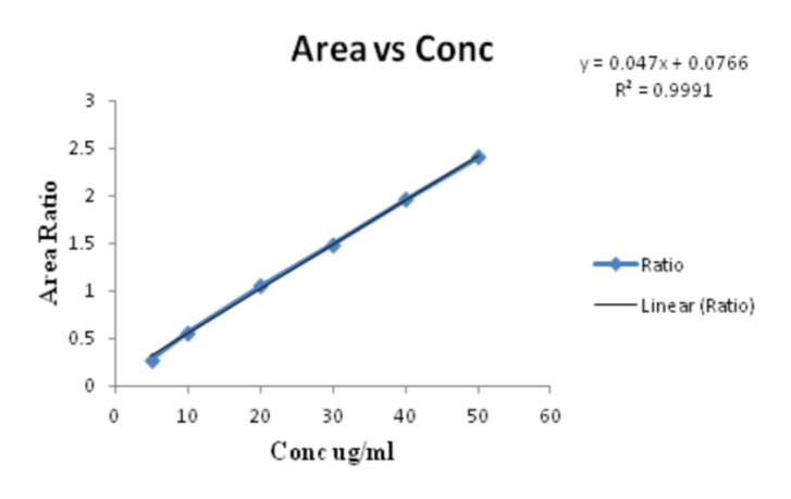 Calibration curves of EFA standard in rat plasma showed a linearity line over the range of 5-50 μg/ml. The data was consistent throughout the experiment which showed a consistency of coefficient, intercept and slope. The calibration curve gives R2 of 0.999 and y-interception was 0.0766 as shown in fig. 3. Peak height ratio of EFA and I. S. of calibration standards were proportional to the concentration of EFA in plasma over the range tested (5-50 µg/ml). The results of the linearity of the method are presented in table 1.