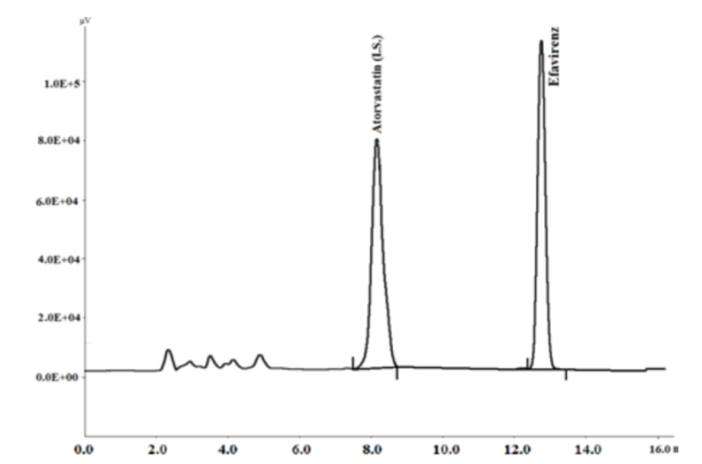 Literature survey reveled that number of HPLC methods for estimation of plasma EFA alone [12-16] and in combination with other antiretroviral agents [17-26] have been reported. While some of these methods involve cumbersome and lengthy extraction procedures [15, 16, 19, 21], few other methods have utilized a complex mobile phase [17, 21] or gradient mobile phase [18,25]. Sample pretreatment by liquid-liquid extraction with diethyl-ether [12, 14, 18, 26] or protein precipitation with acetonitrile [13, 23] has also been carried out in some methods.